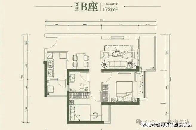 72-74平方米2房2厅1卫:适合年轻夫妇或单身贵族居住,空间布局合理,采光通风良好。