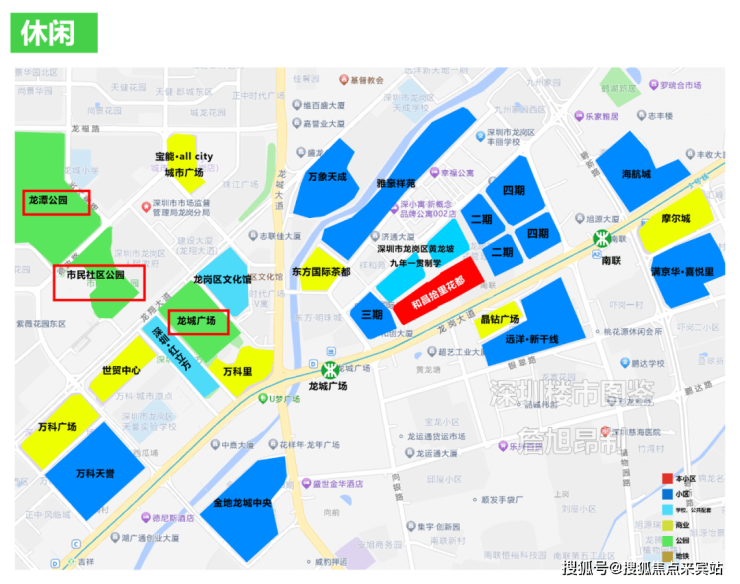 休闲场所距离1公里外可到达龙城广场,业主可前去游玩。