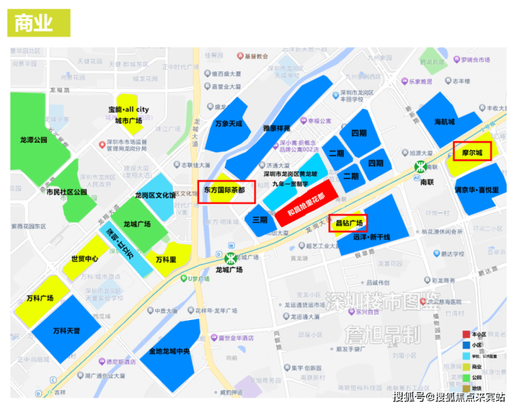 周边距离约360米有晶钻广场,距离1.1公里外可到达摩尔城,除此之外周边还有万科里;深圳龙岗万科广场;世贸中心等商业。