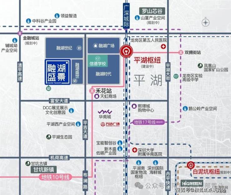 •4地铁:项目距离10号线禾花站约500米(百度测距),连接坂田,直达福田中心区;另有规划中地铁17号线(直连罗湖口岸)/18号线(连通空港新城)/21号线(向西联系南山高新区、前海自贸区等高新区),通勤更高效;