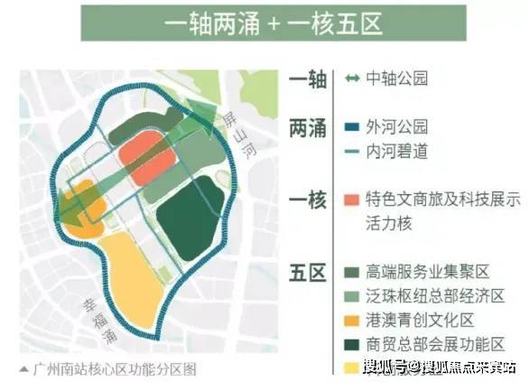 南站CBD,核心区总占地面积约4平方公里,相当于4个珠江新城。空间布局分为“一轴两涌+一核五区”。