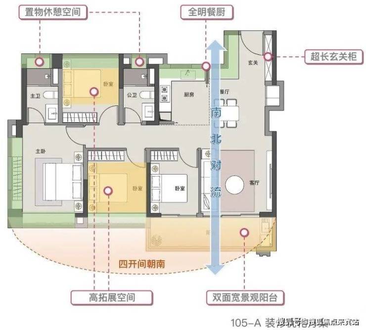 105平户型(1、2栋):(3+1)房2厅2卫,布局和85平相似,也是四开间朝南,阳台连通客厅与次卧,不同的是,北向有个卧室夹在公卫与主卫中间。