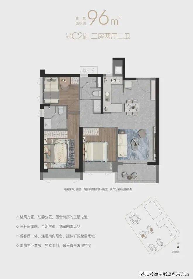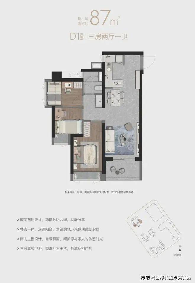“10.7 m纵深紧凑南向三房”,10.7 m纵深餐客一体,通风采光极佳
