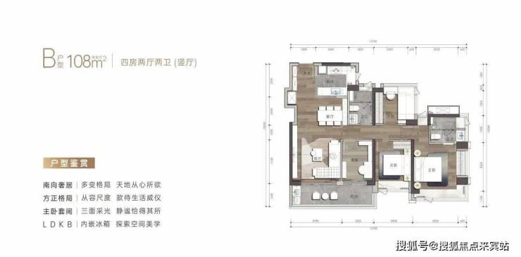 建筑面积约108㎡户型-4房2卫(竖厅)