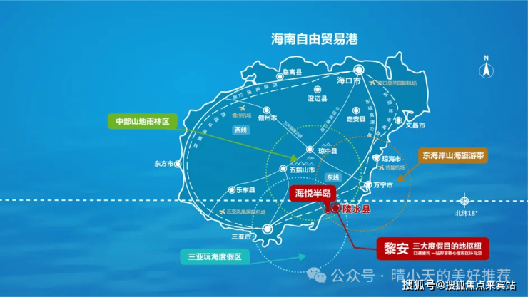 海悦半岛位于北纬18°以南,处于三亚滨海度假区与中部山地雨林区、东南海岸山海旅游度假区交汇区域,进可热带山海,退可一城繁华。于此,开启伴城伴山伴海的美好假期。