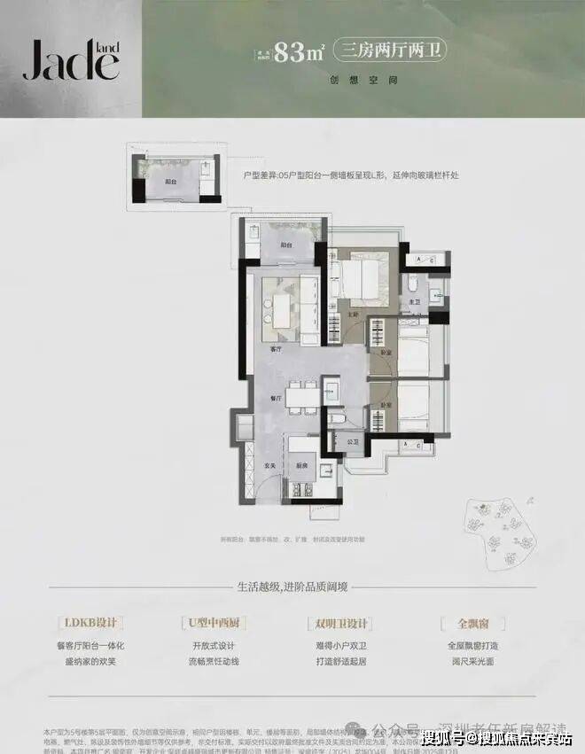 83㎡的3房2厅2卫,设计的是竖厅格局,进门入户玄关,客厅3.2米开间,LDKB一体化,S墙设计预留冰箱卡槽位,U型厨房,主卫少了淋浴,公卫三段式分离,得房率约90.33%(包含赠送),阳台西北朝向。