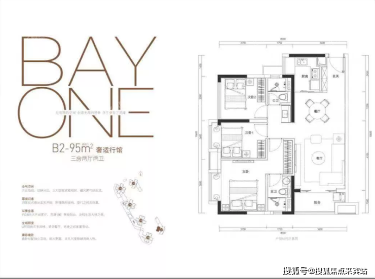 房屋面积为95㎡为三室两厅两卫,方正格局,动静分区,三大卧室紧密相邻,藏风聚气纳生活;拥有约3.6米大开间客厅,贯通180°景观阳台。套卧标配独立卫浴,超大飘窗,非凡尺度敬献湾峰人物。
