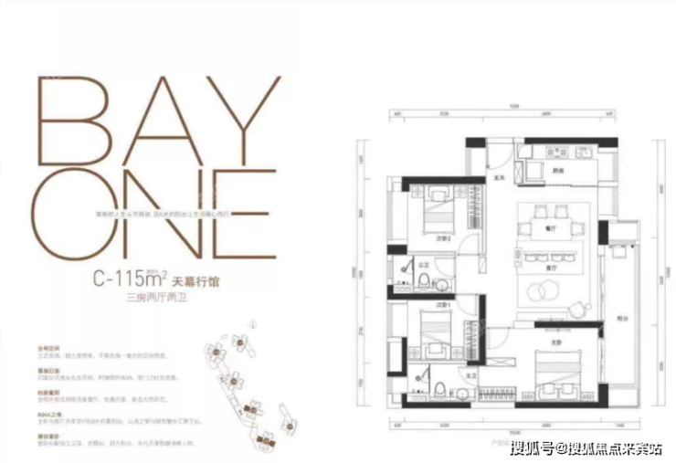房屋面积为115㎡为三室两厅两卫,户型为全明空间、方正格局,拥有超大使用率。全明开放式厨房连接餐厅,彰显大宅风范。主卧与客厅共享宽约5.9米巨幕阳台,山湾之境与城市繁华汇聚于此,卧标配独立卫浴,衣帽间、超大飘窗。
