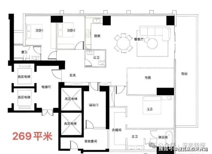 · 269-294㎡户型: 通常是四房以上大户型,注重家庭互动空间与个人私密空间的结合。