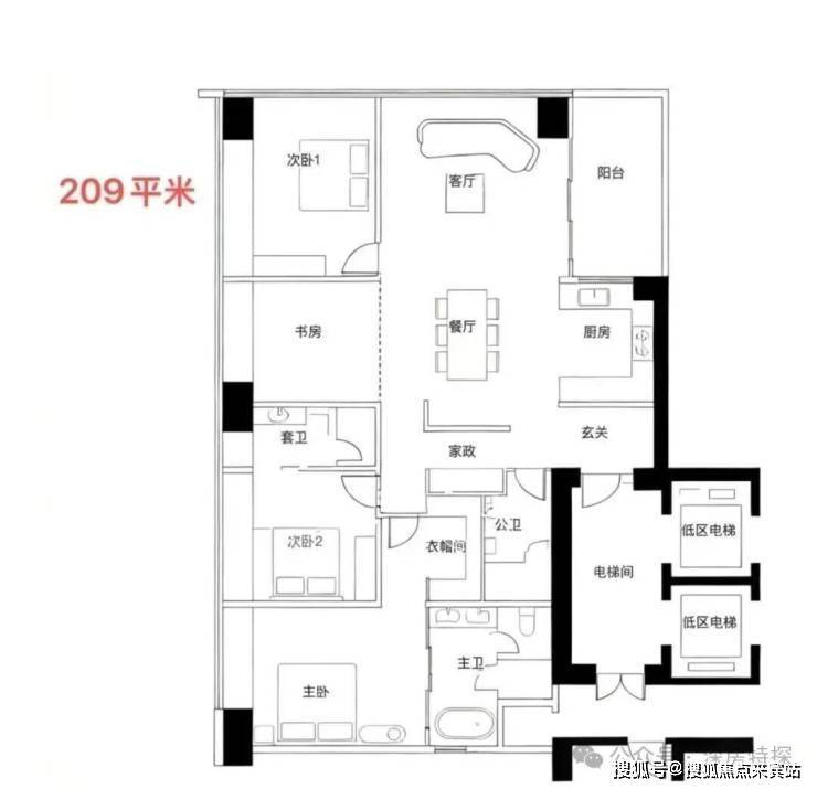 低区(5层起,150米内):约209-304㎡四房以上大户型。