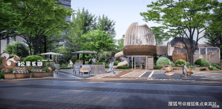 同时,设计萃取镬耳墙、蚝壳窗、海棠纹、拼花砖等岭南元素,将其转译为现代景观语言;引用“园中有园,园中多园”的布局灵感,规划全龄功能场地与五大主题架空层,让森系自然与风雅生活在此碰撞交融。