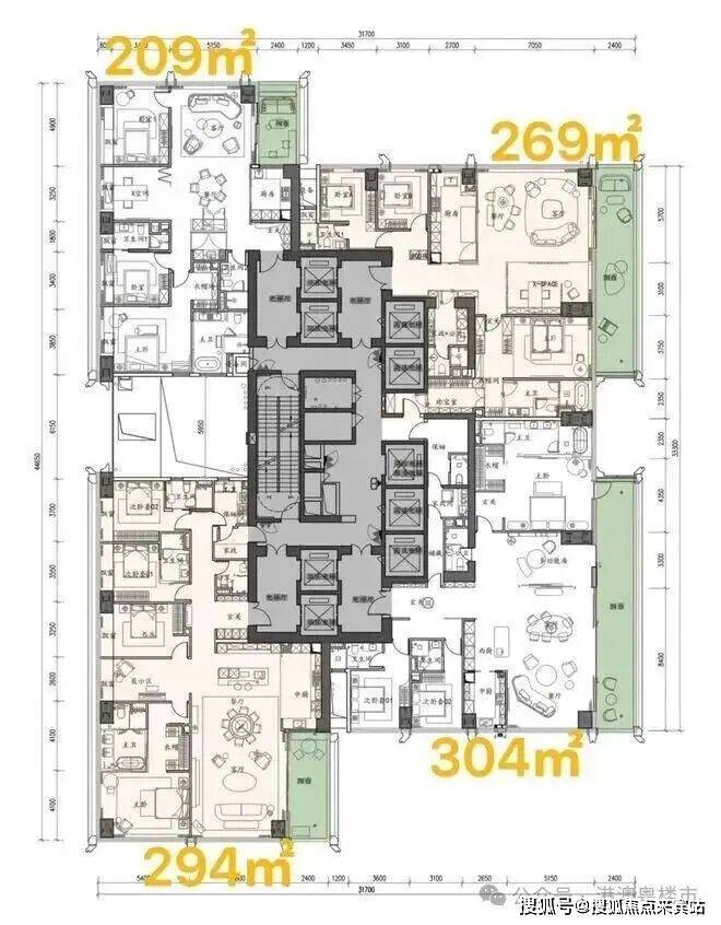 294㎡4房3卫+家政,客厅约11.7米进深、5.8米开间,阳台开间约6.5米。