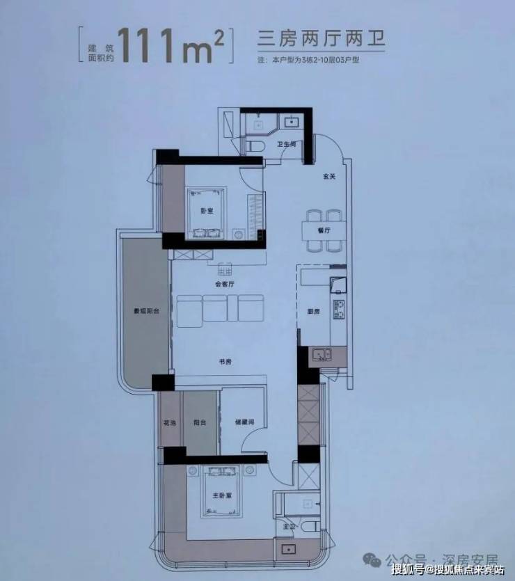 建面约111㎡户型,得房率约94%(包含赠送),西北朝向看一线梧桐山景观。跟102㎡户型布局有点像,也是长条形……