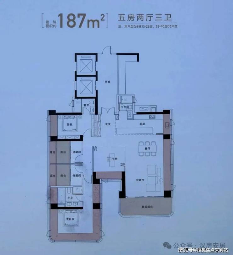 建面约187㎡五房两厅三卫,得房率约111%(包含赠送),西南朝向看海景景观。双套房设计。