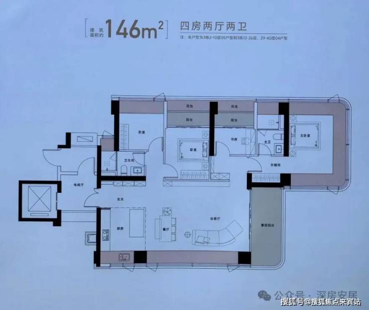 建面约146㎡户型,得房率约105%(包含赠送),东南朝向看海景景观。可视为127㎡户型的升级放大版。