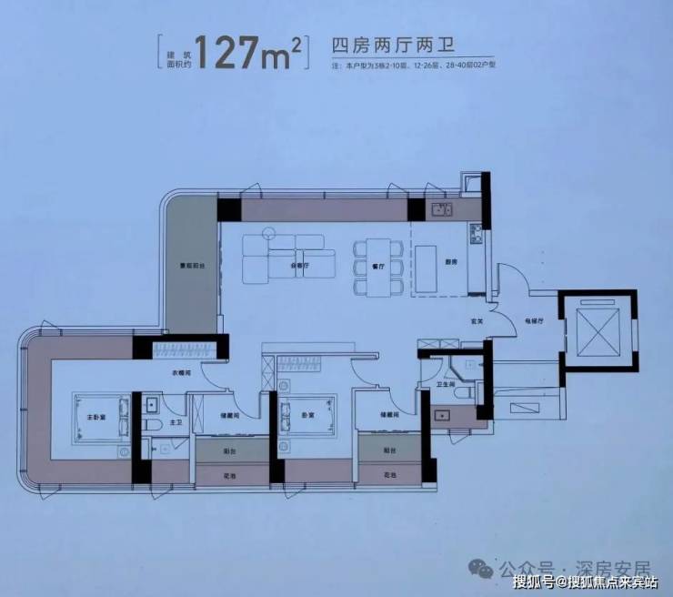 建面约129㎡户型,得房率约105%(包含赠送),东北朝向看一线梧桐山景观。跟127㎡户型只差了2㎡,格局却千差万别。