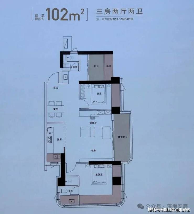 建面约102㎡户型,得房率约94%(包含赠送),东南朝向看海景视野。形状为长条形,虽然标注了是三房两厅两卫,实际报建的只有两个房间。