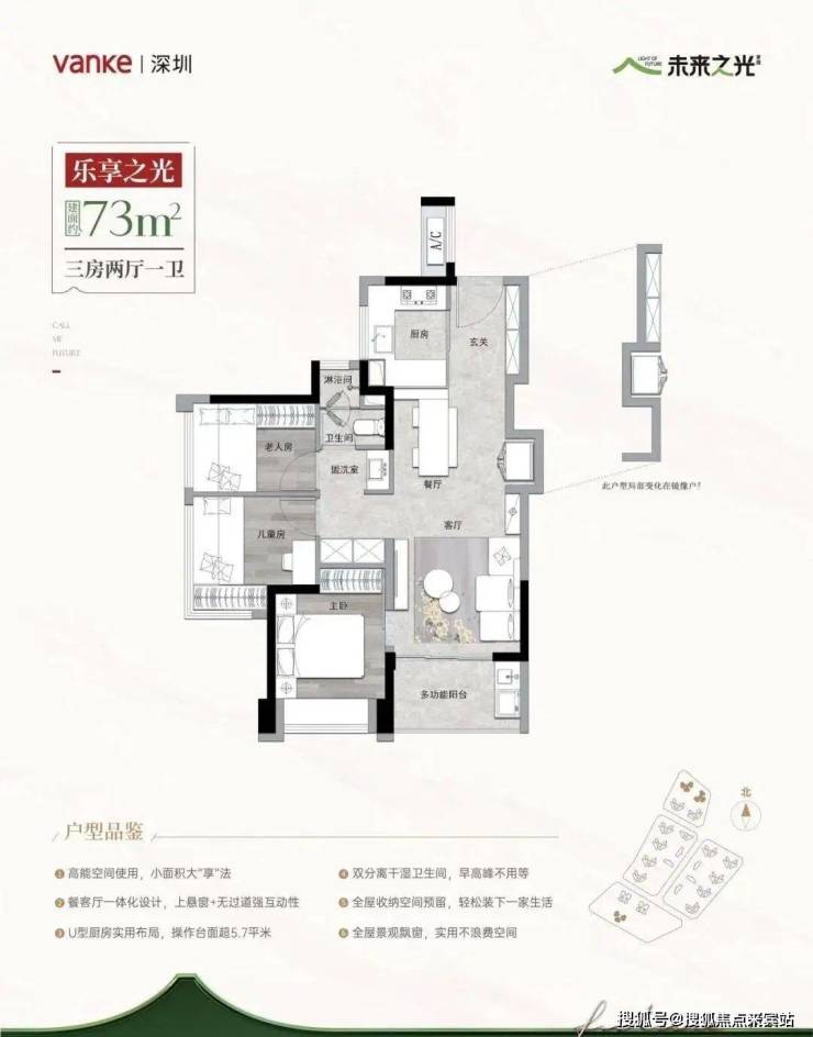 73㎡的3房2厅1卫,设计的是竖厅格局,进门入户玄关,LDKB一体化,S墙设计预留卡槽冰箱位,U型厨房,卫生间三段式分离,得房率79.63%(不含赠送),东北、西南或东南朝向。