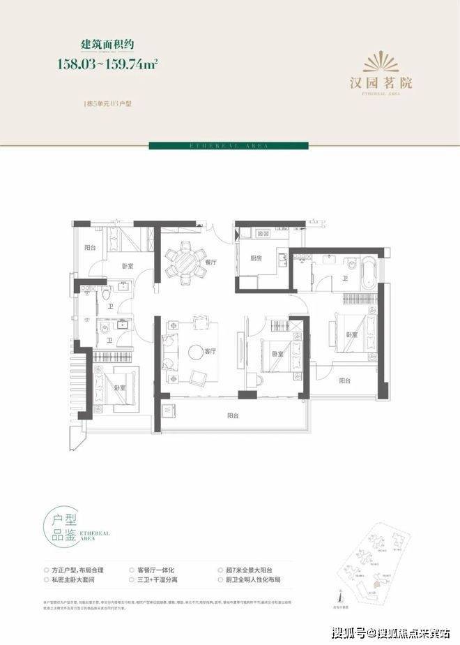 该户型比较方正,面积段在158-159平米左右4房2厅3卫,布局较为合理。餐厅和客厅一体化,同时餐厅紧邻厨房,空间利用度较高。主卧空间较大,为整体套房设计,且自带阳台,通风性好。值得一提的是,该户型有一个超7米的全景大阳台,如果在高楼层,景观肯定不错。