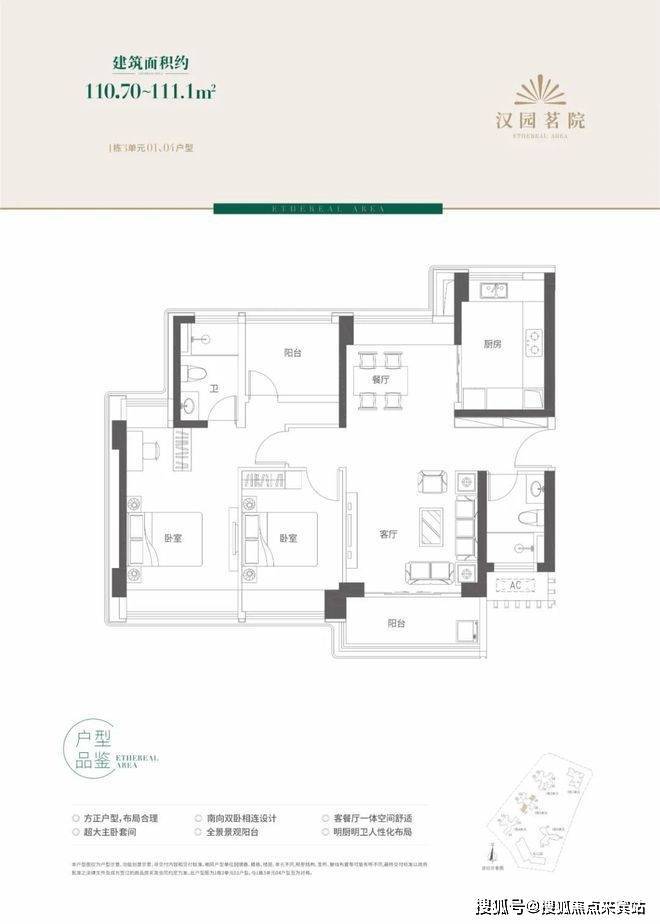 该户型南向双卧相连设计,客餐厅一体十分简洁。值得一提的是该户型厨房十分宽阔,对于乐于厨艺的购房者有更大的发挥空间。该户型面积段在110-111平米左右2房2厅2卫,但有一个阳台面积可以做一部分扩充和利用。