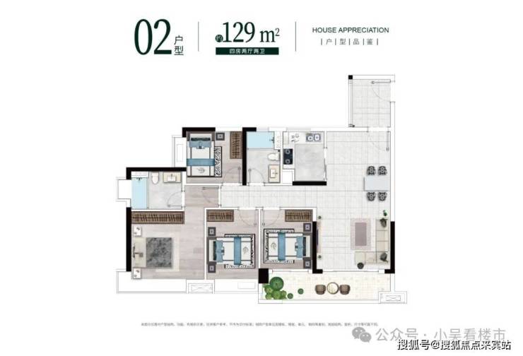 建面129平四房两卫,带入户花园,四开间朝南,三间卧室为南向,景观阳台达到6.6米长,
