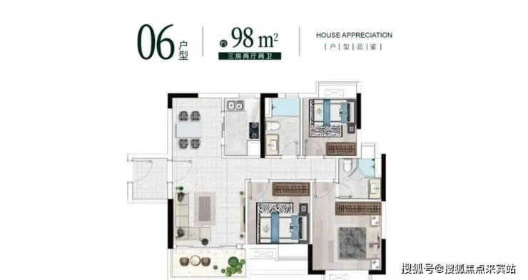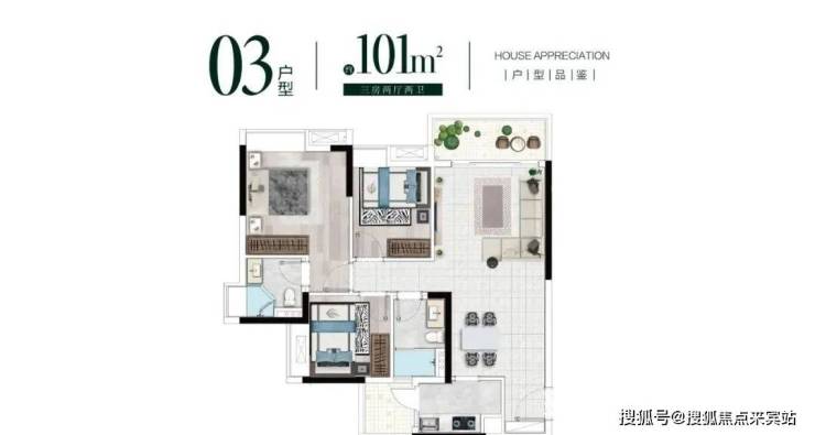 建面101平三房两卫,经典竖厅设计,同样也是双阳台,