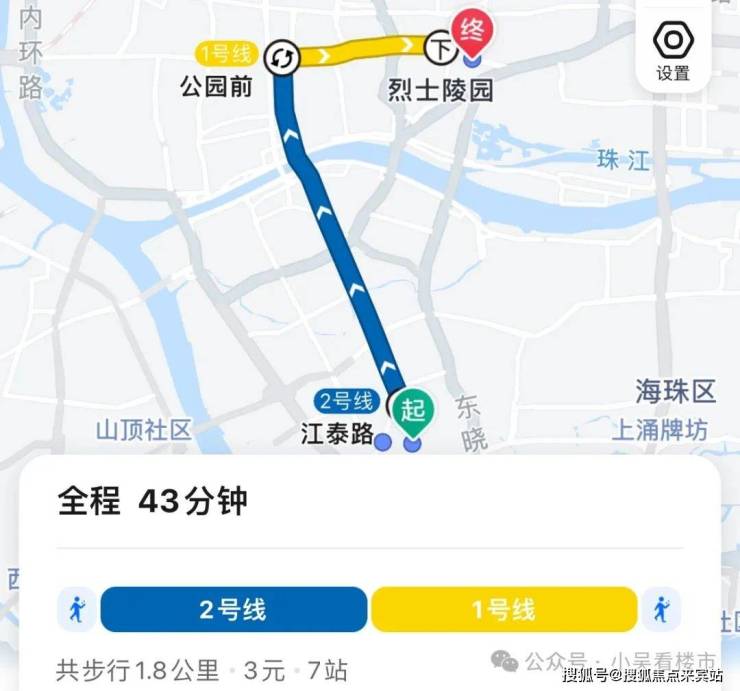 地铁去往越秀中山医:步行至江泰路站,乘坐2号线到公园前换乘1号线,再到烈士陵园全程7个站,耗时43分钟左右。