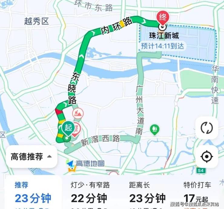 自驾去珠江新城:出小区燕子岗路转江燕路,再转江南大道-昌岗东路至东晓路,再转内环路至黄埔大道,全程10公里,耗时23分钟左右。