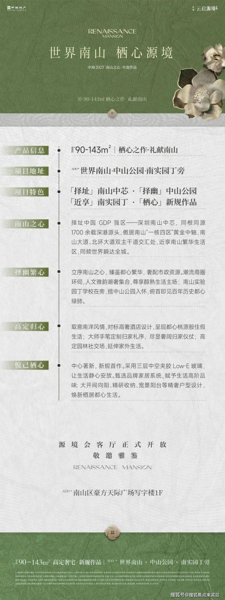 🌳中央公园住区——择幽而栖:项目位于都心静谧的中央公园住区,近邻百年中山公园,拥览约 49 万㎡城央绿肺,占据稀缺的自然资源与景观盛境。(数据来源:孙中山故居纪念馆官网)📒人文菁英高地——优教同源:项目旁即为南实园丁学校,同源南山实验集团优教资源。片区内坐落南实麒麟、深圳艺术学校等优质学校,优教氛围浓厚。🛍漫享精奢烟火——繁华奢境:项目所在南山中芯醇熟生活圈,奢配市政资源,潮流商圈环同,可达前海山姆旗舰店、壹方城、万象前海、壹方汇等购物中心。