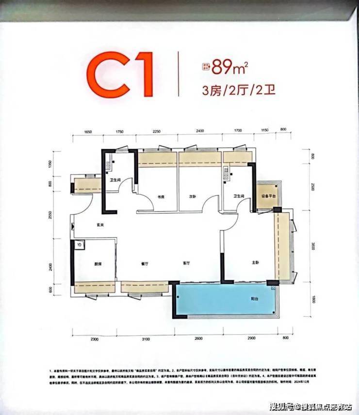 89㎡的3房2厅2卫,设计的是横厅南北通透格局,进门入户玄关,客餐厅5.7米开间,LDKB一体化,四开间朝南,3个卧室分别做到了主卧11.42㎡/次卧7.31㎡/次卧6.93㎡(实测面积,去掉墙体),主卧还带1个设备平台,主卧连接客厅出5.5米长的超大阳台,U型厨房,卫生间三段式分离,赠送面积高达20.09㎡,实际得房率约101%(包含赠送),西南/东南朝向。