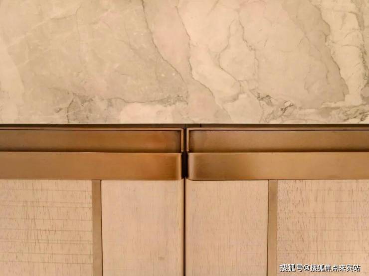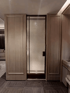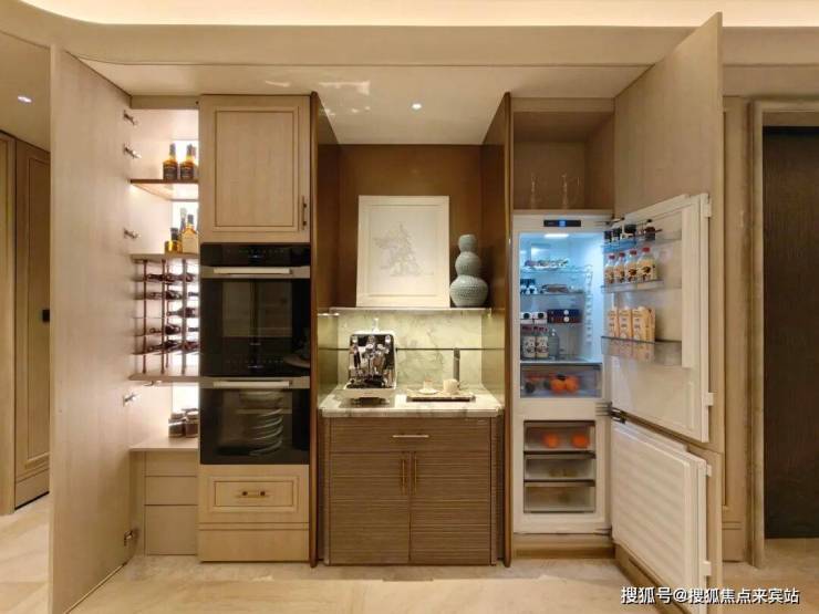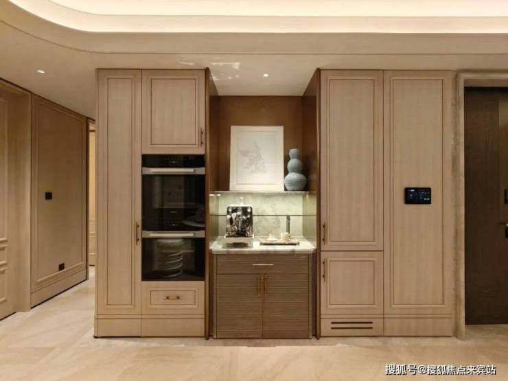 厨房门设计的是口袋门款式,两边均可以收进去墙体里,以鎏金为框,以浮纹为景,口袋门隐于墙,光影藏于家。简约之中,尽显高定人居的细腻质感。