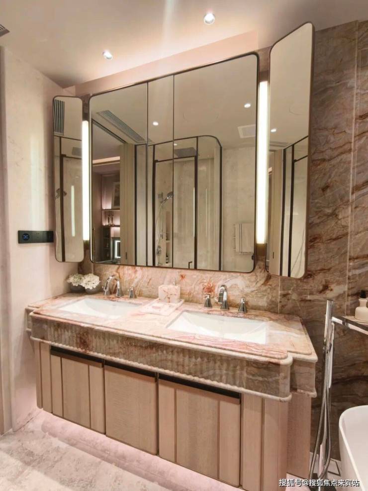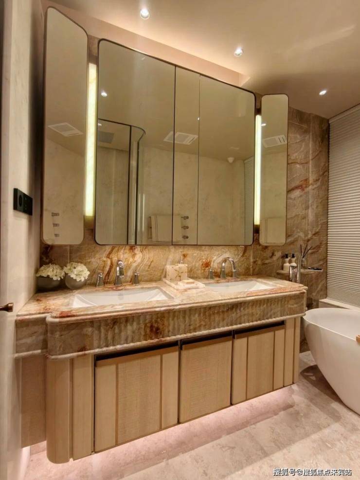 浴室柜以天然染色卡斯拉压纹木饰面为肌理基底,温润木纹自带沉静质感,于细腻触感中勾勒出空间的自然底蕴。搭配大花纹大理石台面,天然石纹肆意舒展,大气磅礴又不失雅致,将石材的原生之美尽数呈现。