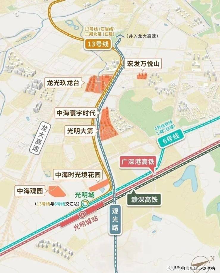 距离在建的13号线同观路站约600米,去光明城站(高铁+地铁站)步行约500米,未来地铁去南山很便捷,出门就是主干道观光路,尅可以很快转上光明大道驱车前往中心区。