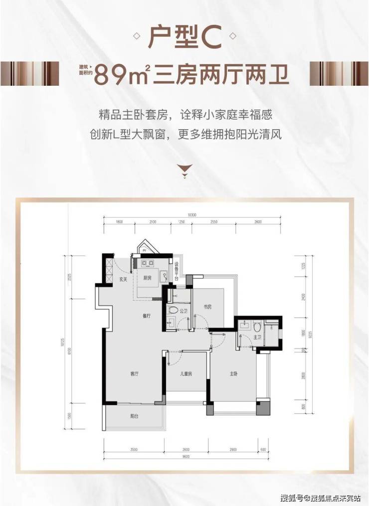 89㎡三房两卫,除了2栋02户型东南朝向,其余均为西南朝向