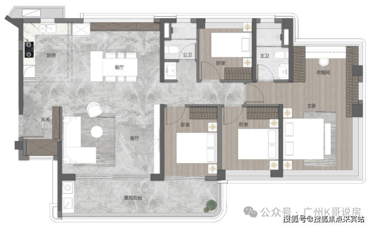 先来看95㎡的户型,南向三房设计,客餐厅和阳台开间去到5.6米,也可改四房,主卧套房设计,带270°大飘窗。