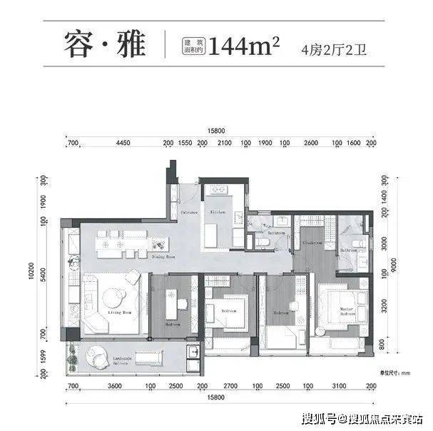 建面约144平的4房户型为南向,四个卧室都是朝南,客厅还做了一个约5.2米的飘窗,采光通风都不错,而且靠近客厅的那个书房用不着还可以打掉,扩大客厅的空间。