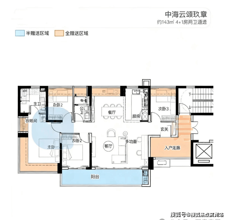 143㎡的4房2厅2卫,设计的是横厅南北通透格局,进门独立入户走廊全赠送,客餐厅分离化设计,横厅大客厅+功能间,五开间朝南,主卧270°无柱转角飘窗+1个次卧朝南,2个次卧朝北向,U型厨房,卫生间干湿分离,得房率约:100%(包含赠送),西南或正南朝向。