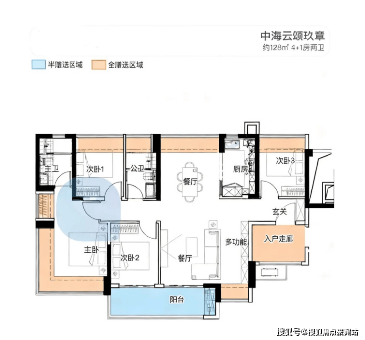 128㎡的4房2厅2卫,设计的是横厅南北通透格局,进门独立入户走廊全赠送,客餐厅分离化设计,横厅大客厅+功能间,五开间朝南,主卧270°无柱转角飘窗+1个次卧朝南,2个次卧朝北向,U型厨房,卫生间干湿分离,得房率约:100%(包含赠送),西南或东南朝向。