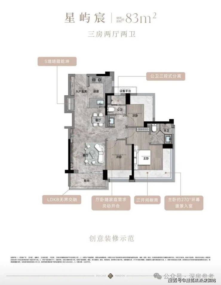 ✅ 主力户型&价格详情:83㎡3房2卫,折后总价299-320万/套,单价3.63-3.88万/㎡,经典竖厅设计,LDKB一体化,三开间朝南,U型厨房,公卫三段式干湿分离,赠送1.98㎡设备平台,阳台5.02㎡,整个小区仅112套,十分稀缺;