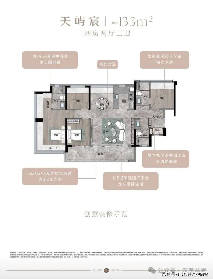 ✅ 133㎡4房3卫,折后总价及单价未明确,备案总价332-588万/套、备案单价4.03-4.42万/㎡,户型设计与117㎡类似,少量供应。