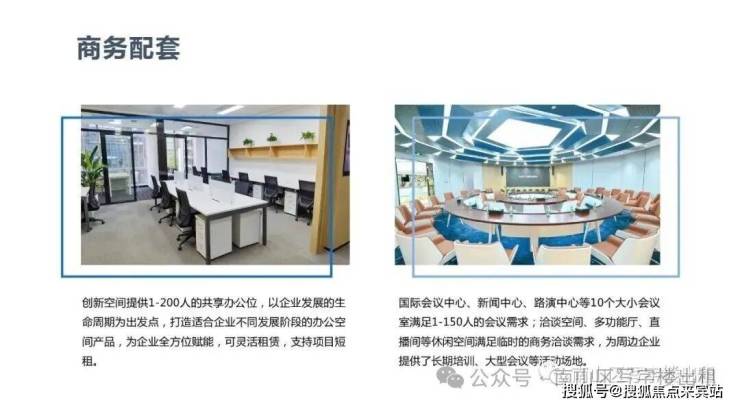国际会议中心、新闻中心、路演中心等10个大小会议室满足1-150人的会议需求;洽谈空间、多功能厅、直播间等休闲空间满足临时的商务洽谈需求,为周边企业提供了长期培训、大型会议等活动场地。