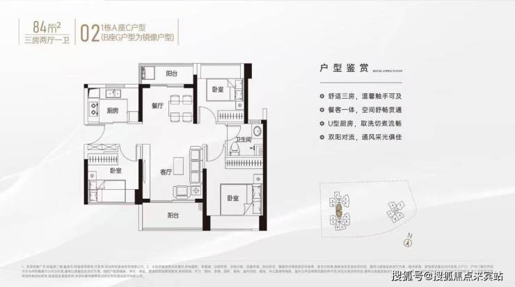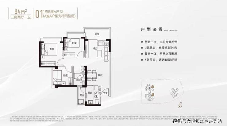 户型面积布局0284平三房两厅一卫设计的是竖厅南北通透格局,客厅3.4米开间,客餐厅双阳台分离化设计,U型厨房,卫生间干湿分离,得房率约79%(不含赠送),客厅阳台主朝东北向。