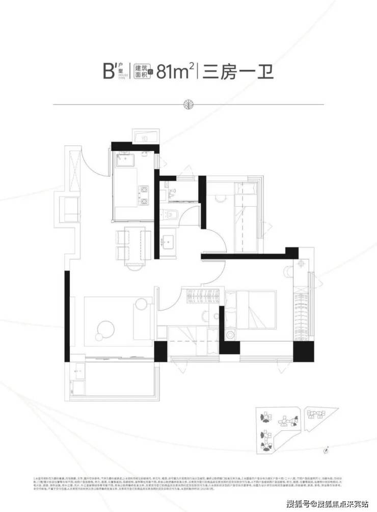 81㎡的3房2厅1卫,B户型,设计的是经典竖厅格局,客厅实测3.45米开间,LDKB一体化,S墙设计预留冰箱卡槽位,动静分区,3个卧室分别做到了主卧12.24㎡/次卧6.2㎡/次卧5.67㎡(去掉墙体,实测面积),L型厨房,卫生间三段式分离,西南/东南或东北朝向。