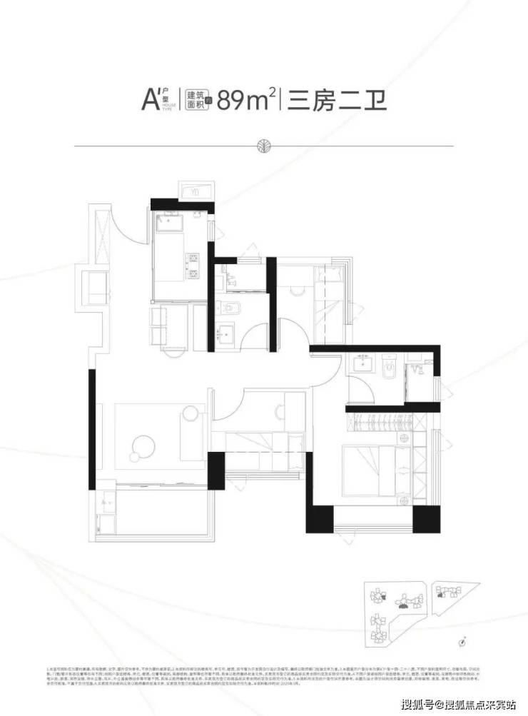89㎡的3房2厅2卫,A户型,设计的是经典竖厅格局,客厅实测3.19米开间,LDKB一体化,S墙设计预留冰箱卡槽位,动静分区,3个卧室分别做到了主卧11.96㎡/次卧5.96㎡/次卧5.85㎡(去掉墙体,实测面积),L型厨房,卫生间干湿分离,东南或东北朝向。