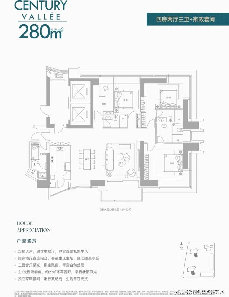 280㎡的4+1房2厅4卫:仅3栋A/B座B户型,双梯入户,设计的是横厅格局,客餐厅8.5米开间,主卧大套间约25㎡,大次卧套间约19㎡(不含卫生间),小次卧约11㎡/8.7㎡,