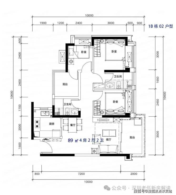 89m²4房2厅2卫,有竖厅和南北通户型,客厅开间3.5米,都有阳台改卧室以及增加客厅进深改造,赠送后得房率在93-96%左右。