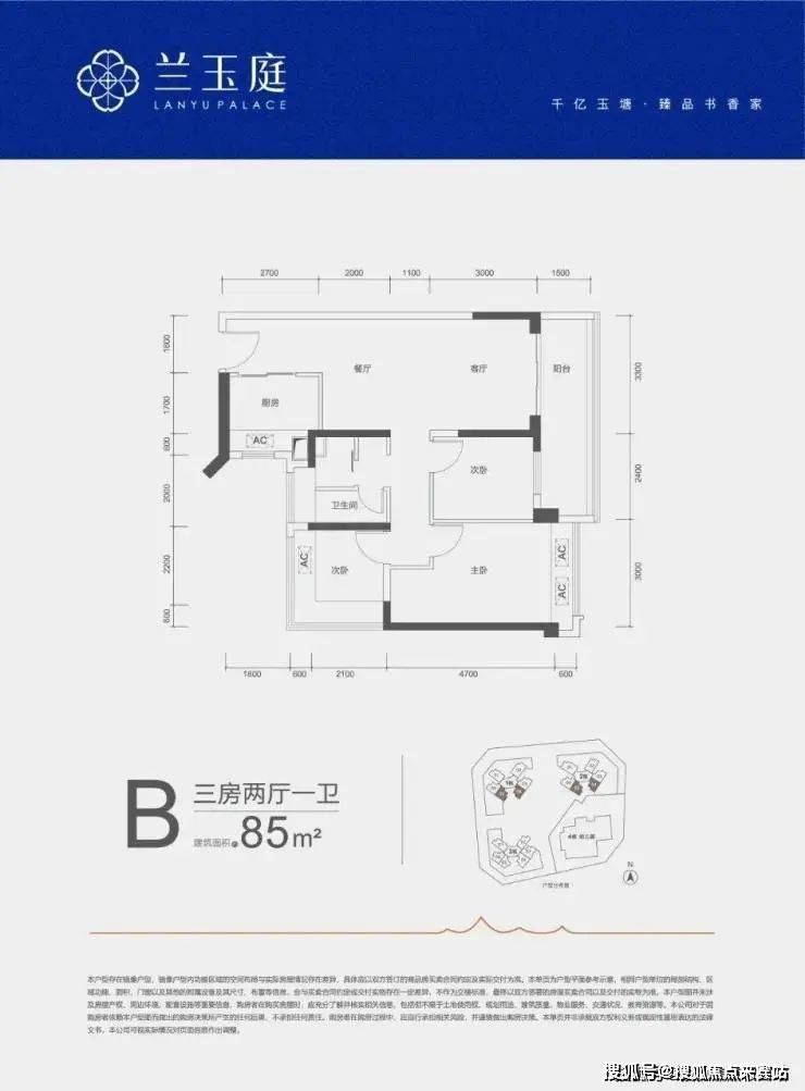 85㎡的3房2厅1卫,B户型,设计的是竖厅格局,客厅开间3.3米,LDKB一体化,三开间朝南,3个卧室分别做到了3米/2.7米/2.4米的宽度,客厅连接次卧出5.7米长的大阳台,L型厨房,创新式三分离卫生间,得房率约79%(不含赠送),西南或东南朝向。