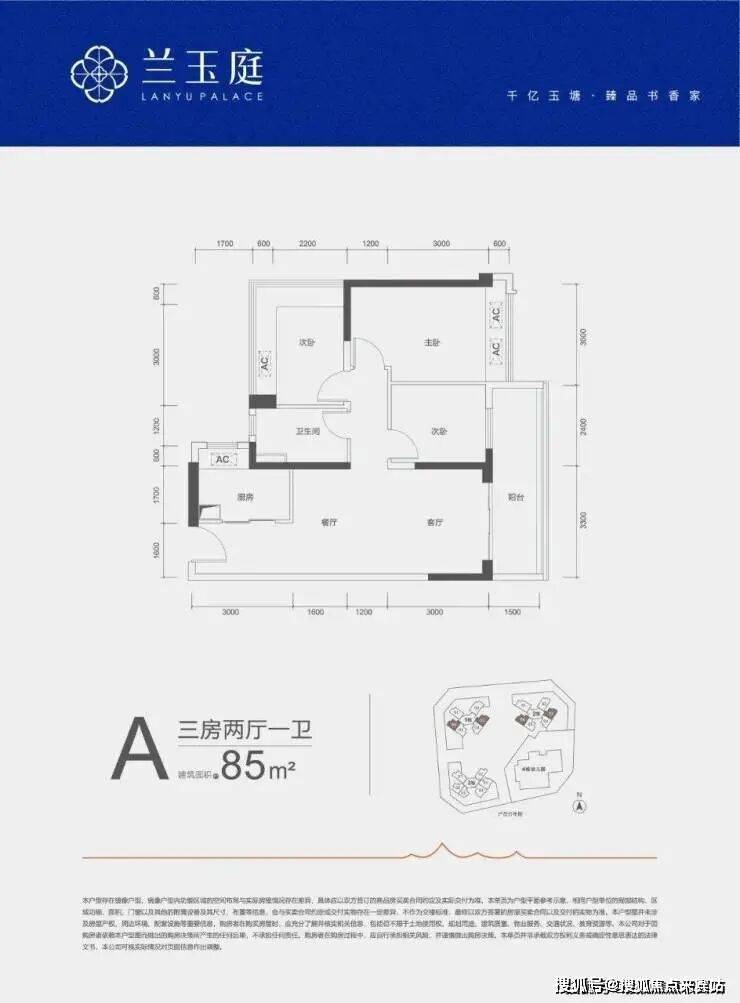 85㎡的3房2厅1卫,A户型,设计的是竖厅格局,客厅开间3.3米,LDKB一体化,三开间朝南,3个卧室分别做到了3米/2.8米/2.4米的宽度,客厅连接次卧出5.7米长的大阳台,L型厨房,得房率约79%(不含赠送),西南或东南经向。