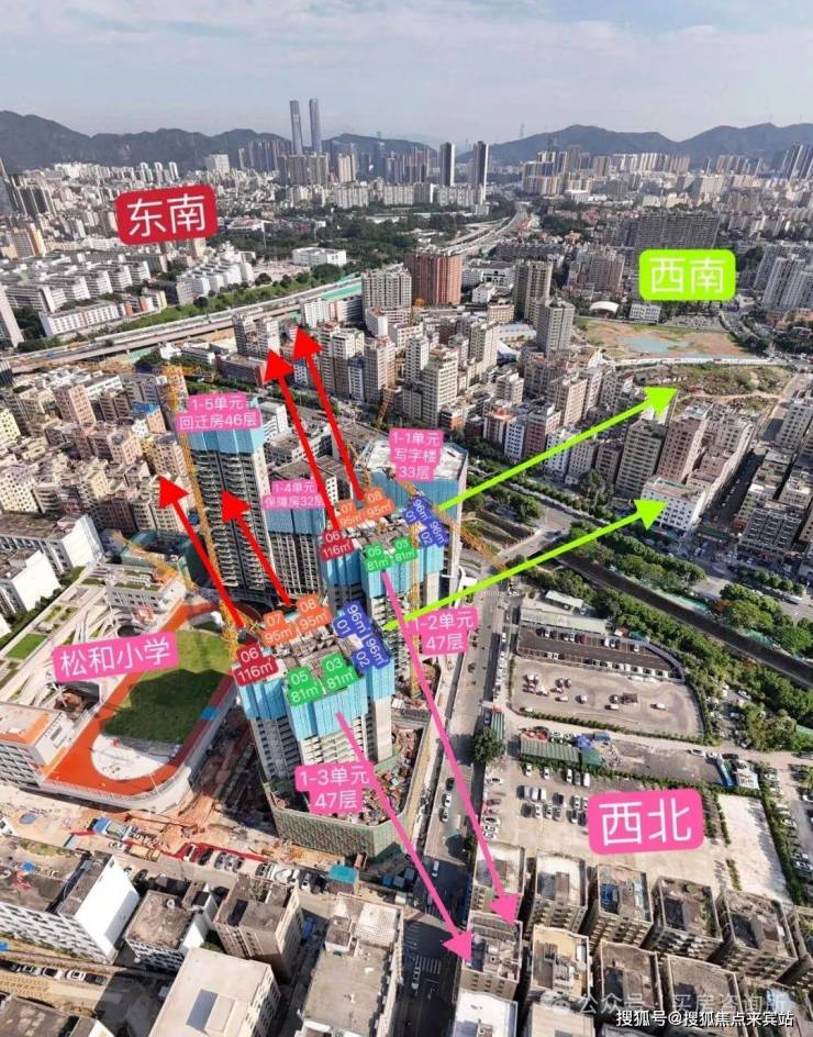 项目由6栋建筑组成,分为1栋1/2/3/4/5单元和2栋幼儿园,总户数约882户,住宅可售610套,规划车位1290个。其中1栋2单元、1栋3单元为商品住宅,共47层,1栋1单元为商办,共33层,1栋4单元为公租房住宅和少量商品住宅,共32层,1栋5单元为回迁房住宅,共46层,2栋幼儿园共4层。