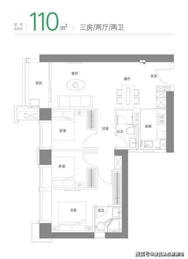 110㎡三房两厅两卫:是入门级的三房户型,共 320 套。该户型动静分区合理,休息区与活动区互不干扰。卧室标配飘窗,餐客一体化且连通阳台,空间开阔,为全家欢聚提供了宽敞舒适的场所。主卧私享化,配备独立卫浴和衣帽间,为居住者提供了私密舒适的居住空间。